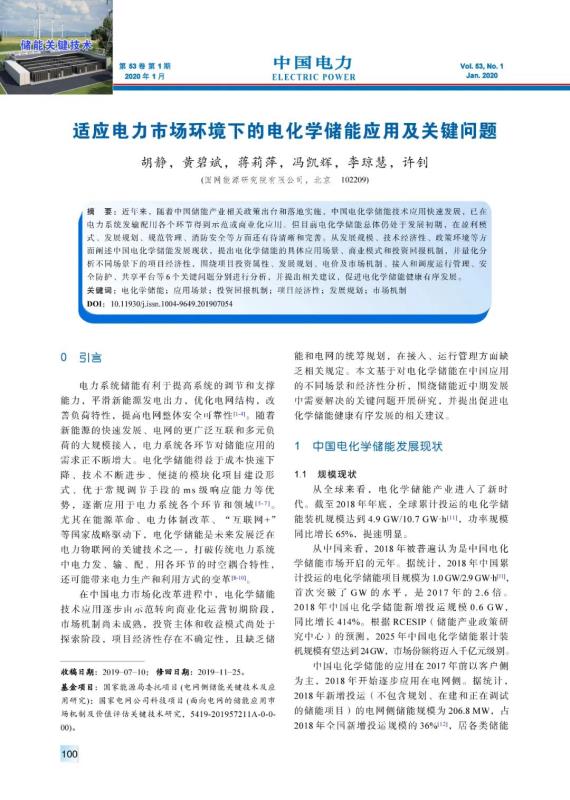 HU Jing, HUANG Bibin, JIANG Liping, et al. Application and major issues of electrochemical energy storage under the environment of power market[J]. Electric Power, 2020, 53(1): 100-107.