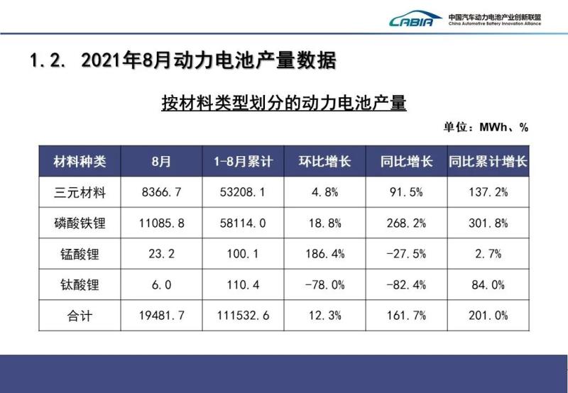 產(chǎn)量方面,2021年8月,我國(guó)動(dòng)力電池產(chǎn)量共計(jì)19.5GWh,同比增長(zhǎng)161.7%,環(huán)比增長(zhǎng)12.3%。其中三元電池產(chǎn)量8.4GWh,占總產(chǎn)量42.9%,同比增長(zhǎng)91.5%,環(huán)比增長(zhǎng)4.8%;磷酸鐵鋰電池產(chǎn)量11.1GWh,占總產(chǎn)量56.9%,同比增長(zhǎng)268.2%,環(huán)比增長(zhǎng)18.8%。1-8月,我國(guó)動(dòng)力電池產(chǎn)量累計(jì)111.5GWh,同比累計(jì)增長(zhǎng)201.0%。其中三元電池產(chǎn)量累計(jì)53.2GWh,占總產(chǎn)量47.7%,同比累計(jì)增長(zhǎng)137.2%;磷酸鐵鋰電池產(chǎn)量累計(jì)58.1GWh,占總產(chǎn)量52.1%,同比累計(jì)增長(zhǎng)301.8%。