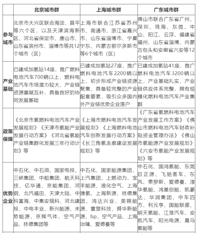 三大示范城市群產(chǎn)業(yè)布局與發(fā)展目標(biāo)雖各有不同,但均已形成了較為完整的產(chǎn)業(yè)體系,擁有穩(wěn)定的氫源和綠氫供應(yīng)潛力,依托各地相關(guān)政策支持,集聚了一批有實(shí)力的企業(yè),并擁有廣闊的應(yīng)用市場可供產(chǎn)業(yè)發(fā)展壯大。
