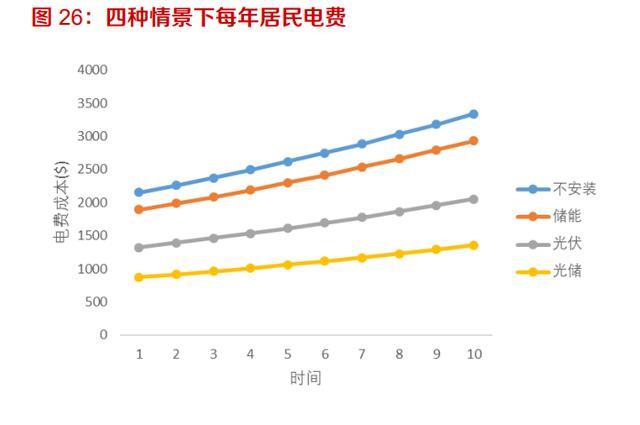 根據(jù)計算結(jié)果,十年里,四種情景下光儲系統(tǒng)的每年電費比不安裝光伏和儲能系統(tǒng)低 59%;安裝 光伏比不安裝低 38%;由于美國居民用電量高,且峰谷價差大,安裝儲能的年用電費也比不安裝 低 12%。綜合設(shè)備成本、設(shè)備維護(hù)費用及電費來看,相比于不安裝的情景,在全壽命周期內(nèi),安裝 光儲及單獨安裝光伏都具備一定的經(jīng)濟(jì)性,單獨安裝光伏的累計成本為$23918.93,安裝光儲系統(tǒng) 的累計成本為$22422.01。使用時間超過 8 年,安裝光儲系統(tǒng)相比于其他方案跟節(jié)約成本。