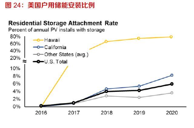 家庭安裝光儲系統(tǒng)可以獲得明顯的經(jīng)濟(jì)收益。根據(jù)伯克利實驗室的統(tǒng)計,截至 2020 年表后側(cè)安裝 儲能容量約為 1000MW,其中 550MW 與太陽能光伏配對。目前絕大多數(shù)戶用儲能與光伏配對 (80%),非住宅儲能只有 40%與光伏共建。美國戶用光儲共建比例最高的是夏威夷州,其次是 加州。電化學(xué)儲能系統(tǒng)的成本逐年下降,目前光儲系統(tǒng)的成本在$5/W,聯(lián)邦范圍內(nèi)安裝光儲系統(tǒng) 可以獲得 ITC 稅收減免 30%,亞利桑那州、加州等提供額外的光儲系統(tǒng)退稅,用戶可以通過峰谷 套利、自發(fā)自用等方式節(jié)省用電費用。光儲系統(tǒng)使用 5-10 年之后可以回收部分成本。綜合計算后 系統(tǒng)可以獲得$500-1000/kWh 的經(jīng)濟(jì)收益。