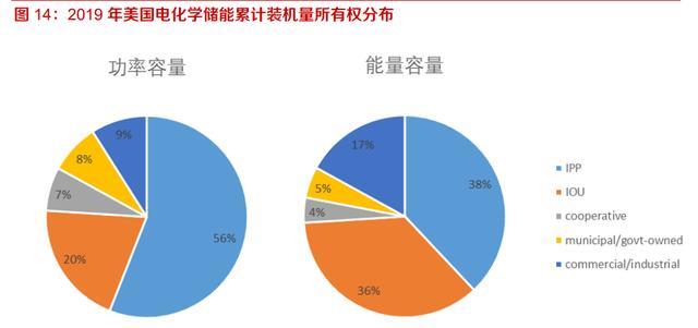 美國儲能應(yīng)用場景包括表前(Front of the Meter,F(xiàn)TM)和表后(Behind the Meter,BTM), 對應(yīng)于國內(nèi)應(yīng)用場景的劃分,表前通常指電網(wǎng)側(cè)和發(fā)電側(cè),表后指用戶側(cè),包括家庭和工商業(yè)。目 前美國表前側(cè)儲能市場分屬于不同的區(qū)域電力市場,目前較大的為PJM市場、CAISO市場、ERCOT 市場等,儲能的市場供給參與方包括 IPP(獨立發(fā)電商)、IOU(投資者擁有的公用事業(yè)端)等。 根據(jù) EIA 統(tǒng)計,截至 2019 年,IPP 擁有美國大型電化學(xué)儲能現(xiàn)有功率容量的 56%,IOU 擁有 20%, 而針對能量市場,IPP 擁有 38%,IOU 擁有 36%。