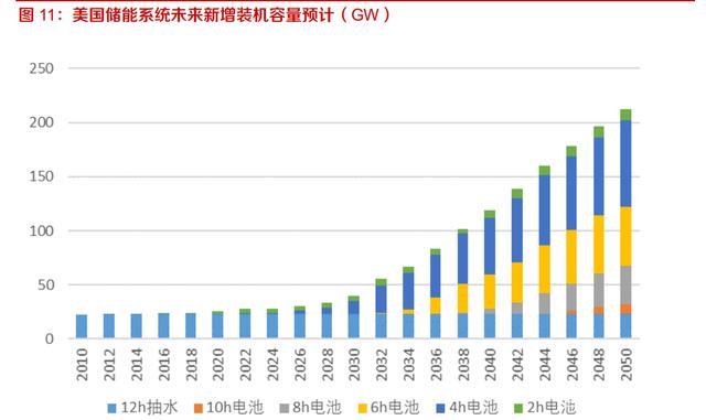 目前美國用戶側(cè)儲能的滲透率較低,由于獨立住宅數(shù)量大,市場遠(yuǎn)未飽和,且用戶側(cè)儲能自發(fā)自用, 經(jīng)濟(jì)性強,用電可靠性增加,未來市場巨大。長期來看,根據(jù) NREL 預(yù)測,2050 年美國儲能總裝 機(jī)將超過200GW,雖然目前抽水蓄能占據(jù)了九成左右的市場,未來電化學(xué)儲能是主要的增長動力, 其中當(dāng)前新增裝機(jī)以 2h 和 4h 儲能系統(tǒng)為主,未來逐漸向長時儲能發(fā)展,以 4h 和 6h 儲能系統(tǒng)為 主。