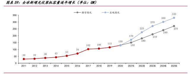 1)全球光伏新增裝機(jī)量:裝機(jī)量的預(yù)測(cè)以中國(guó)光伏行業(yè)協(xié)會(huì)在《2020中國(guó)光伏產(chǎn)業(yè)發(fā)展路線圖》中對(duì)于“保守情況”的指引為主要依據(jù),到2025年國(guó)內(nèi)新增光伏裝機(jī)量達(dá)到100GW左右,全球新增裝機(jī)接近300GW。