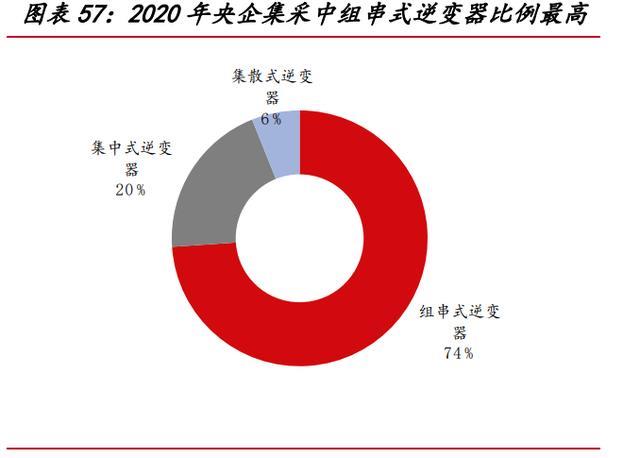 單瓦價(jià)差縮小,2021上半年招標(biāo)中組串式占比明顯高于集中式。據(jù)中國(guó)光伏行業(yè)協(xié)會(huì),2020年我國(guó)組串式和集中式逆變器市場(chǎng)平均價(jià)格分別為0.18元/W和0.11元/W,0.06元/W的價(jià)差相對(duì)于整體光伏系統(tǒng)3.5-4.0元/W的價(jià)格來(lái)說(shuō),僅占總成本的1.6%左右,逐漸縮小的價(jià)差為組串式在大型電站中的推廣創(chuàng)造了條件。據(jù)索比光伏網(wǎng)對(duì)2021上半年20.37GW的光伏逆變器中標(biāo)信息的統(tǒng)計(jì),其中組串式占比81%,集中式占比19%。 另?yè)?jù)PV-Tech對(duì)2020年約24GW的央企光伏逆變器集采招標(biāo)結(jié)果的統(tǒng)計(jì),統(tǒng)計(jì)項(xiàng)目中組串式招標(biāo)總量超17.74GW,占比73.93%,集中式占比20.00%,集散式占比6.06%。