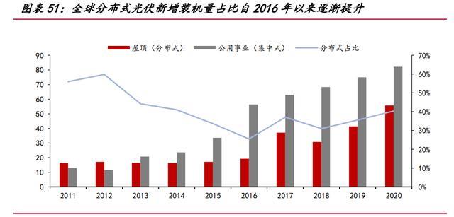 分布式裝機(jī)占比逐步提升。在全球范圍內(nèi),屋頂光伏市場(chǎng)相較公用事業(yè)規(guī)模的光伏市場(chǎng)增長(zhǎng)更對(duì)迅速,在2020年新增裝機(jī)占比中達(dá)到了40%左右。在國(guó)內(nèi),2013年以來(lái),國(guó)內(nèi)歷年新增光伏裝機(jī)中,分布式裝機(jī)量占比整體呈上升趨勢(shì)。2021上半年,全國(guó)分布式新增裝機(jī)同比增長(zhǎng)97.5%,集中式新增裝機(jī)同比下降24.2%;戶(hù)用新增裝機(jī)占比42%,成為新增裝機(jī)的主要來(lái)源。