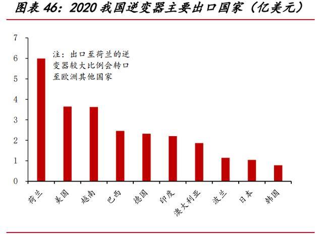 歐洲和亞洲是當(dāng)前我國(guó)逆變器出口最主要的市場(chǎng)。2020年,我國(guó)出口至歐洲和亞洲的逆變器總額分別為12.5和11.4億美元,同比增長(zhǎng)31.44%和43.43%;并且2021年前6個(gè)月對(duì)歐洲市場(chǎng)的出口額已經(jīng)達(dá)到9.2億美元,相當(dāng)于2019年全年的水平。2020年我國(guó)對(duì)北美地區(qū)的出口額下滑20.04%,主要受到了中美貿(mào)易糾紛的影響,部分企業(yè)通過(guò)在海外設(shè)立工廠以應(yīng)對(duì)此類(lèi)情況。