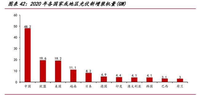 1)全球范圍內(nèi)光伏新增裝機(jī)需求持續(xù)提升。2020年,全球光伏市場(chǎng)在新冠疫情的影響下依舊實(shí)現(xiàn)了加速增長(zhǎng),全年新增裝機(jī)量約130GW,同比增長(zhǎng)13.0%,增幅較2019年上升了4.5pct。中國(guó)2020年新增光伏裝機(jī)48.2GW,同比增長(zhǎng)60.1%;美國(guó)新增裝機(jī)19GW,同比提升42.9%,中美兩國(guó)分別位列2020年全球新增裝機(jī)前兩名。越南由于補(bǔ)貼政策的變更,在2020年出現(xiàn)搶裝潮,新增裝機(jī)10.75GW,同比增長(zhǎng)92.0%,躍居全球第三大裝機(jī)市場(chǎng)。