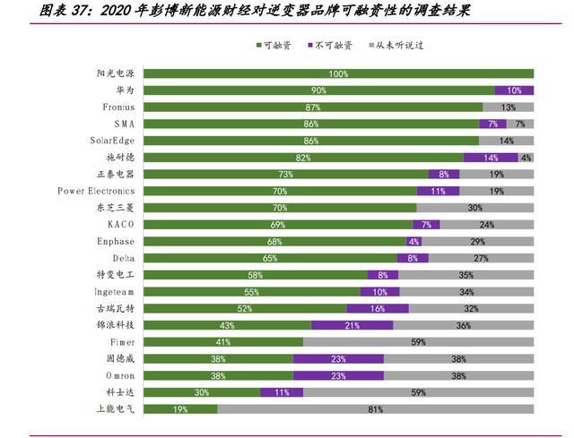 國(guó)內(nèi)廠商在海外品牌認(rèn)可度逐漸提升。2020年彭博新能源財(cái)經(jīng)通過(guò)向可再生能源項(xiàng)目的投資方發(fā)放問(wèn)卷等形式,對(duì)逆變器品牌的可融資性進(jìn)行了調(diào)查。排名較高的品牌意味著更易幫助項(xiàng)目開(kāi)發(fā)商獲得銀行融資,利于綁定長(zhǎng)期客戶(hù)群體;另一方面說(shuō)明該品牌逆變器在產(chǎn)品質(zhì)量、運(yùn)行表現(xiàn)、售后服務(wù)支持和長(zhǎng)期可靠性方面表現(xiàn)突出,利于海外布局的拓展。陽(yáng)光電源以100%的得票率當(dāng)選“全球最具融資價(jià)值的逆變器品牌”,華為位居第2名,共有9家中國(guó)企業(yè)上榜;顯示出國(guó)內(nèi)廠商在海外擴(kuò)張業(yè)務(wù)的過(guò)程中,品牌價(jià)值得到提升,逐漸得到海外投資方的認(rèn)可。
