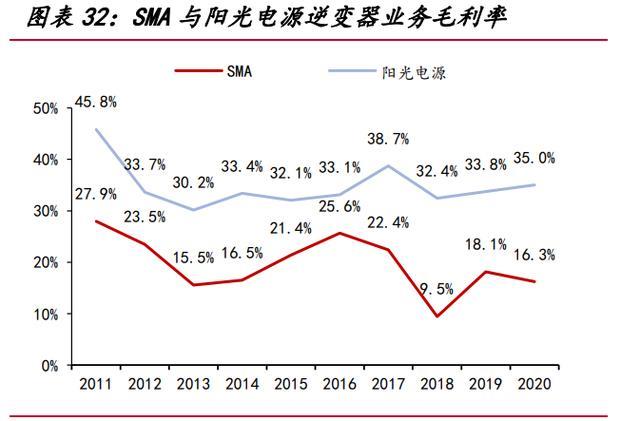 2017年以來(lái),隨著行業(yè)技術(shù)的不斷進(jìn)步,電子元器件產(chǎn)品的更新?lián)Q代速度加快,價(jià)格水平逐年下降,下游光伏逆變器企業(yè)的采購(gòu)成本也受益降低。以固德威為例,2017-2019年,公司功率器件、電感、電容和控制組件等電子元器件采購(gòu)單價(jià)基本均呈現(xiàn)不同幅度下滑,疊加國(guó)內(nèi)較低的人工成本,國(guó)內(nèi)逆變器廠商在低售價(jià)的前提下仍能保持較高的毛利率水平。以陽(yáng)光電源和SMA兩家產(chǎn)品線齊全的產(chǎn)商為例,2020年陽(yáng)光電源逆變器業(yè)務(wù)毛利率為35.0%,而SMA僅為16.3%。在此背景下,國(guó)產(chǎn)廠商依舊存在降價(jià)空間以搶占更大的海外市場(chǎng)份額。