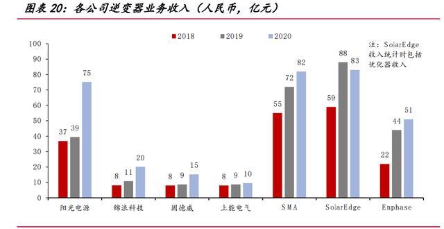 1)公司體量的差異:國(guó)內(nèi)上市企業(yè)中,陽(yáng)光電源逆變器業(yè)務(wù)收入遠(yuǎn)高于其他可比公司,2020年光伏逆變器收入75.15億元,錦浪科技、固德威和上能電氣2020年逆變器業(yè)務(wù)的收入分別為20.19、15.23和9.53億元。國(guó)外企業(yè)中,SolarEdge、SMA和Enphase 2020年逆變器相關(guān)業(yè)務(wù)收入折算人民幣約為83、82和51億元。