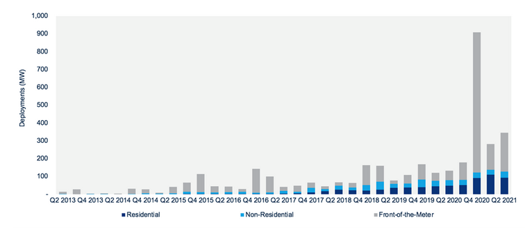 報告還指出,美國住宅儲能系統(tǒng)的部署自從2018年第四季度(連續(xù)九個季度前)以來首次出現(xiàn)下滑,這是由于儲能設備和供應鏈限制阻礙了該領(lǐng)域的增長。與此同時,非住宅(社區(qū)和商業(yè)和工業(yè))部署環(huán)比增長31%。馬薩諸塞州的社區(qū)儲能市場最近一直在增長,這也為此做出了貢獻。