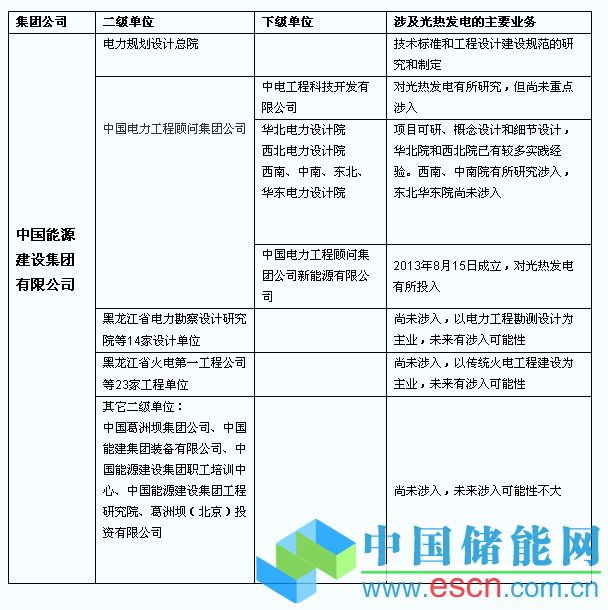 中國(guó)能建旗下下轄中國(guó)葛洲壩集團(tuán)公司、中國(guó)電力工程顧問集團(tuán)公司、電力規(guī)劃設(shè)計(jì)總院、中國(guó)能建集團(tuán)裝備有限公司、多家設(shè)計(jì)單位、多家工程企業(yè)等眾多組織和機(jī)構(gòu)。其中在光熱發(fā)電領(lǐng)域有較多涉及的二級(jí)單位是電力規(guī)劃設(shè)計(jì)總院和中國(guó)電力工程顧問集團(tuán)公司。
