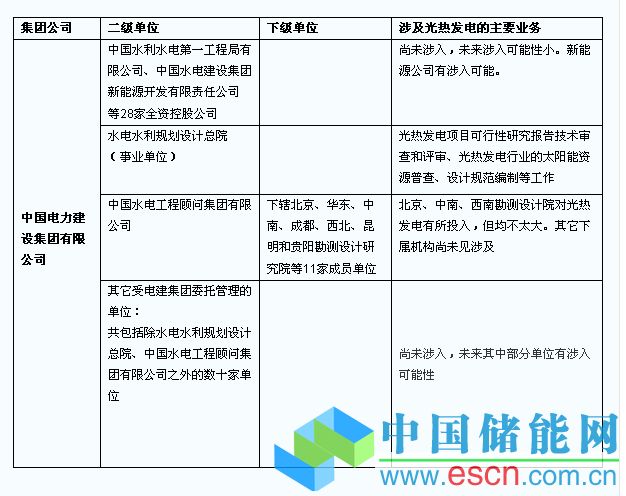 中國電建旗下下轄中國水利水電第一工程局有限公司等28家全資控股公司,大部分都以水利水電工程建設為主業(yè)。其中中國水電建設集團新能源開發(fā)有限責任公司是唯一一家以太陽能和風電等新能源開發(fā)為主業(yè)的全資子公司,但該公司對光熱發(fā)電尚無涉及,未來有可能涉及。