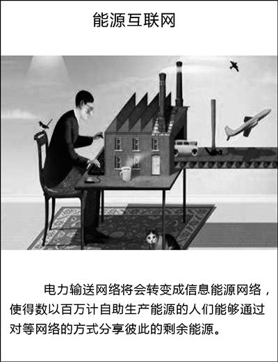 電力輸送網(wǎng)絡(luò)將會(huì)轉(zhuǎn)變成信息能源網(wǎng)絡(luò),使得數(shù)以百萬(wàn)計(jì)自助生產(chǎn)能源的人們能夠通過對(duì)等網(wǎng)絡(luò)的方式分享彼此的剩余能源。