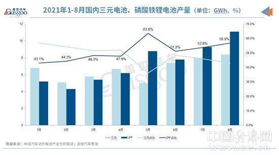 來自中國汽車動(dòng)力電池產(chǎn)業(yè)創(chuàng)新聯(lián)盟最新一期的動(dòng)力電池月度數(shù)據(jù)顯示,2021年8月,我國動(dòng)力電池產(chǎn)量共計(jì)19.5GWh,同比增長161.7%,環(huán)比增長12.3%。其中,磷酸鐵鋰電池產(chǎn)量11.1GWh,占總產(chǎn)量56.9%,同比增長268.2%,環(huán)比增長18.8%;三元電池產(chǎn)量8.4GWh,占總產(chǎn)量42.9%,同比增長91.5%,環(huán)比增長4.8%。