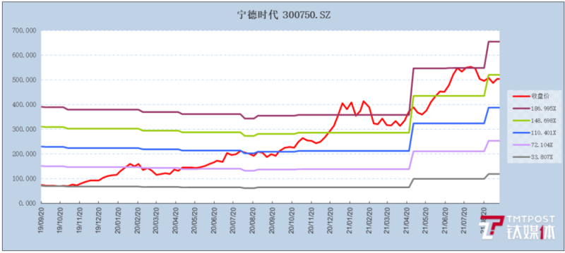 考慮到公司未來的成長性,我們用PEG方法對公司股價進(jìn)行一下分析,可以看到公司PE(TTM)從2020年以來保持了快速的增長,目前PE較7月份有所下降,目前在144左右,公司2021年上半年凈利潤增速為148.38%, 如果僅是根據(jù)上半年凈利潤增速來看,PEG小于1,以目前凈利潤的增速是對股價有支撐的,但是考慮到未來三五年內(nèi)公司凈利潤維持如此高的增速基本是很困難的,這也就說明市場目前對公司的估值其實是相當(dāng)樂觀的,或許寧德時代已經(jīng)考慮到這一點,而目前積極開發(fā)鈉電池,尋找新的利潤增長點正是主要的應(yīng)對措施之一。