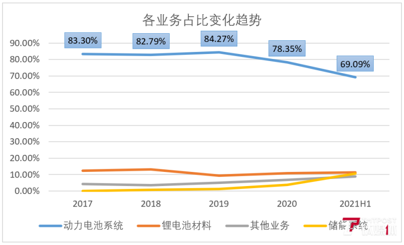 作為拉動營收增長主要的動力電池系統(tǒng)業(yè)務(wù)部分,雖然2021年上半年收入有較大幅度增長,但其對營收的貢獻(xiàn)比例下降至69.09%, 鋰電材料與儲能系統(tǒng)對營收貢獻(xiàn)率均超過10%。