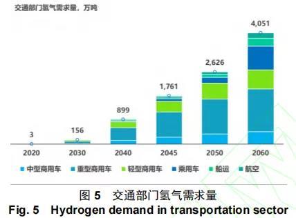 提高能源效率是緩解能源需求總量攀升的重要路徑,但是在目前使用內(nèi)燃機(jī)和石油的情況下,能源效率提高并不能實(shí)現(xiàn)交通領(lǐng)域零排放。交通運(yùn)輸部門要實(shí)現(xiàn)碳中和,將需要道路交通全面電氣化,同時(shí)航空和船運(yùn)逐步替換使用零碳燃料等。在碳中和情景下,預(yù)計(jì)到 2060 年交通部門氫消費(fèi)量約 4000 萬噸,如圖5 所示。