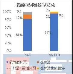在實(shí)際使用中,氫循環(huán)解決方案需要滿足不斷拓展的燃料電池應(yīng)用要求,同時(shí)還要綜合考慮氫循環(huán)部件技術(shù)成熟度、成本等多種因素,因此近年來(lái)國(guó)內(nèi)市場(chǎng)氫循環(huán)解決方案在不斷發(fā)生變化,新供應(yīng)商和新解決方案不斷涌現(xiàn)。2020年與2021H1氫循環(huán)技術(shù)路線市場(chǎng)分布如下: