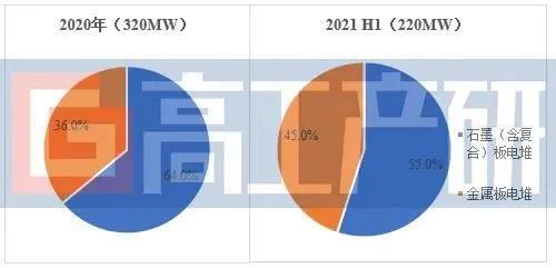 從電堆類型來(lái)看,今年金屬板電堆出貨比重進(jìn)一步增加。2021年H1已出貨電堆中,石墨(含復(fù)合)板電堆占比55%,金屬板電堆占比45%。預(yù)計(jì)2021年全年金屬板電堆有望與石墨(含復(fù)合)板電堆平分市場(chǎng)。
