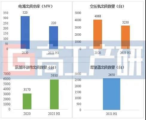 今年上半年,燃料電池系統(tǒng)四大核心部件的出貨量均超預(yù)期。高工產(chǎn)研氫電研究所(GGII)調(diào)研數(shù)據(jù)顯示,2021 H1中國(guó)氫燃料電池電堆出貨功率為220MW,約占2020年全年出貨功率的70%;氫循環(huán)部件出貨量為5930臺(tái),出貨量為去年數(shù)量的1.5倍;空壓機(jī)出貨量為3230臺(tái),接近2020年全年出貨量的80%;增濕器出貨超2500臺(tái)。