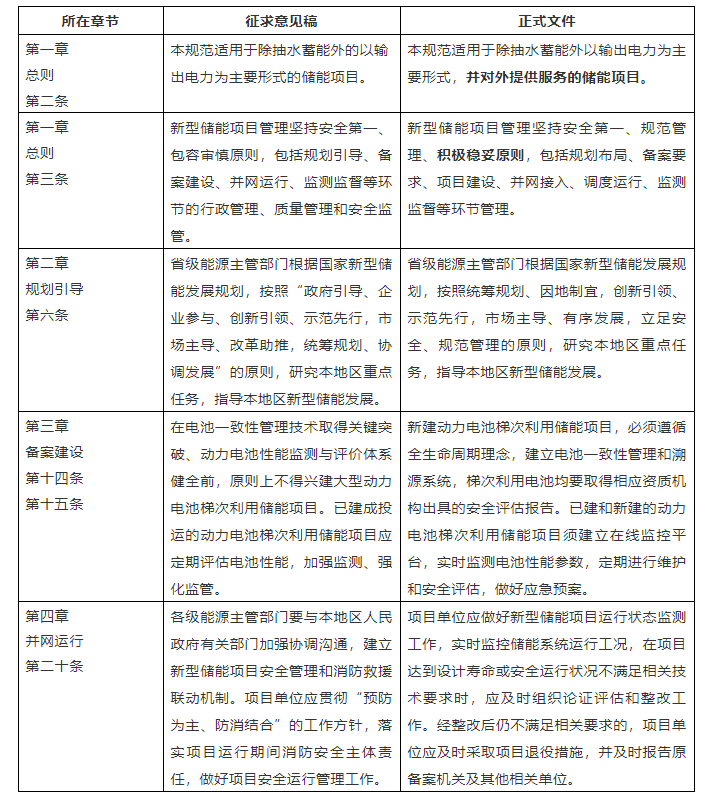 《新型儲(chǔ)能項(xiàng)目管理規(guī)范》征求意見(jiàn)稿與正式文件對(duì)比:
