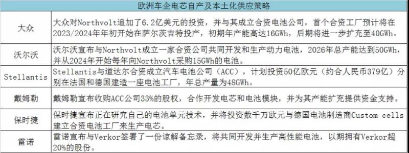 值得注意的是,除了戴姆勒之外,包括大眾、沃爾沃、保時(shí)捷、雷諾、Stellantis等多家歐洲主機(jī)廠,也通過(guò)入股或合資建廠的方式與歐洲本土電池企業(yè)達(dá)成合作,目的是為其自產(chǎn)電芯尋找合作伙伴,并鎖定部分產(chǎn)能保障其電池供應(yīng)穩(wěn)定。