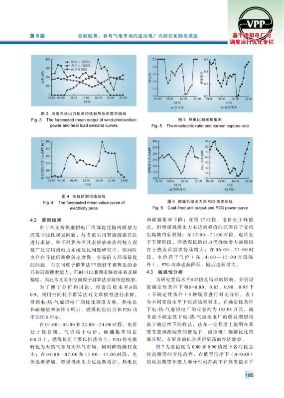 結(jié)論:(1)考慮電價和風(fēng)光出力不確定性的電-熱-氣虛擬電廠隨機(jī)優(yōu)化模型所得收益的期望值高于確定性模型,從而降低了確定性模型的調(diào)度保守性,使得虛擬電廠有更多的機(jī)會獲得更高的經(jīng)濟(jì)效益,更適于其市場行為。(2)電-熱-氣虛擬電廠的收益與置信水平之間存在的負(fù)相關(guān)關(guān)系,更切實(shí)地反映了投資領(lǐng)域中的低風(fēng)險低收益、高風(fēng)險高收益的特點(diǎn),電廠決策者可根據(jù)自身風(fēng)險偏好來權(quán)衡風(fēng)險與收益之間的關(guān)系。(3)將虛擬電廠從僅參與電力市場擴(kuò)展到同時參與電力市場和天然氣市場,有利于獲得更好的經(jīng)濟(jì)效益和調(diào)度運(yùn)行的靈活性。若進(jìn)一步考慮未來氣價和熱價的隨機(jī)性,則可更加反映多種市場的特點(diǎn)。虛擬電廠參與氣電市場的研究方法可擴(kuò)展至其參與多種市場如電、氣、熱市場、旋轉(zhuǎn)備用市場等的研究。
