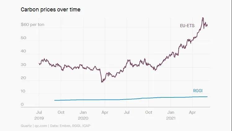除了電力供給突然的變化、天然氣原料價(jià)格上漲。歐洲碳價(jià)的飛漲也是本輪刺激歐洲電價(jià)的主要原因之一。過(guò)去十年左右的時(shí)間里,歐洲碳價(jià)基本在50歐元以?xún)?nèi)。但是今年碳價(jià)一路上揚(yáng),甚至突破了60歐元。