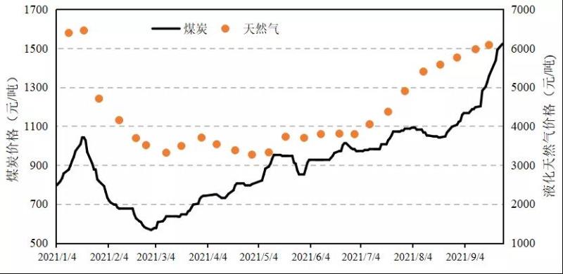 圖1 2021年1-9月份煤炭?jī)r(jià)格和天然氣價(jià)格走勢(shì)