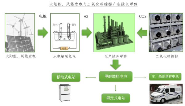 儲(chǔ)能方面,新能源發(fā)電與二氧化碳結(jié)合,制造“綠色甲醇”;把風(fēng)能太陽能以液體甲醇的形式儲(chǔ)存下來,使得甲醇成為風(fēng)能太陽能的儲(chǔ)運(yùn)載體,成為風(fēng)能太陽能液體儲(chǔ)能路線??梢缘统杀?、大規(guī)模實(shí)現(xiàn)能源的儲(chǔ)存和運(yùn)輸。