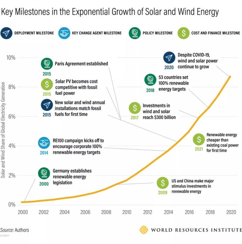 基于可再生能源在過(guò)去的指數(shù)增長(zhǎng),我們有理由對(duì)其在未來(lái)達(dá)到氣候目標(biāo)的速度更加樂(lè)觀。本文試圖解讀太陽(yáng)能和風(fēng)能增長(zhǎng)背后的原因、已經(jīng)取得了多大的進(jìn)展,以及需要進(jìn)一步做些什么。