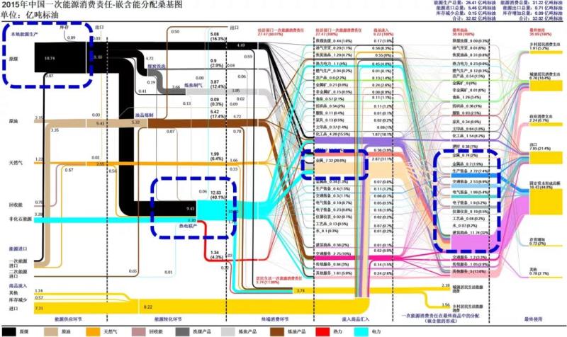 圖 4 2015年我國一次能源消費(fèi)責(zé)任—嵌含能分配?;鶊D