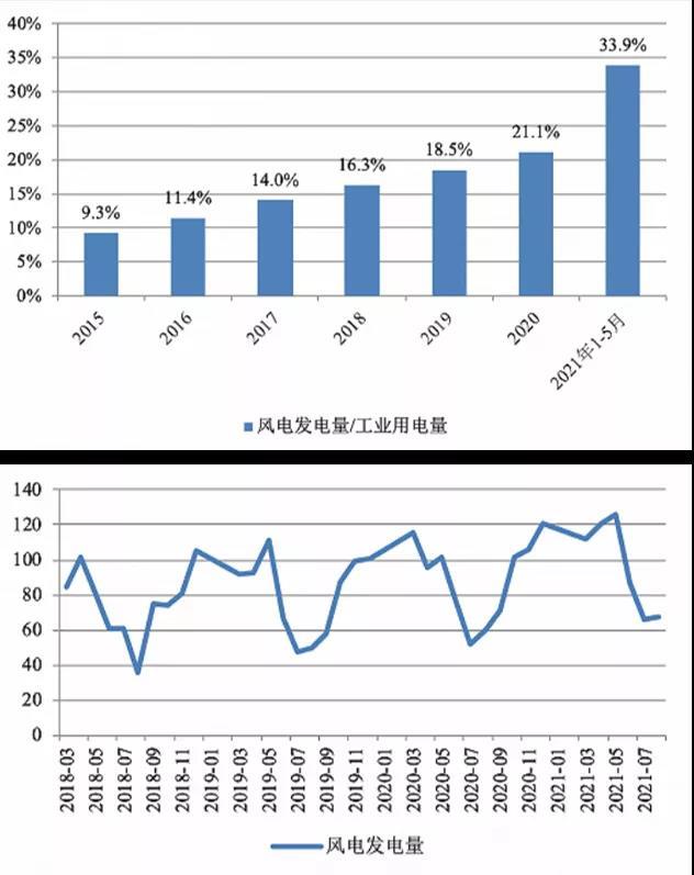 圖 2 東北地區(qū)風(fēng)電發(fā)電量占工業(yè)用電比重(上圖)和風(fēng)電發(fā)電量(億kWh)變化趨勢(下圖)