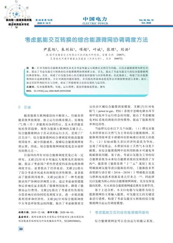 尹晨旭, 朱劉柱, 項(xiàng)超, 等. 考慮氫能交互轉(zhuǎn)換的綜合能源微網(wǎng)協(xié)調(diào)調(diào)度方法[J]. 中國電力, 2020, 53(10): 88-95, 148.