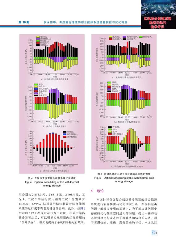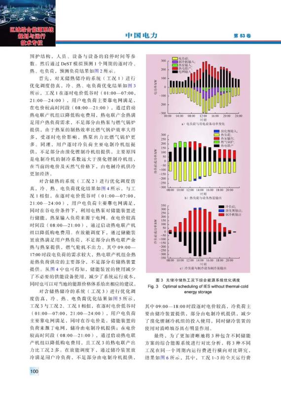 結(jié)論:本文針對(duì)包含復(fù)合儲(chǔ)熱儲(chǔ)冷裝置的綜合能源系統(tǒng)進(jìn)行能量模擬與優(yōu)化調(diào)度分析,在提供這類(lèi)問(wèn)題一般解決步驟的基礎(chǔ)上,為了解決該問(wèn)題中存在的優(yōu)化搜索空間過(guò)大的問(wèn)題,提出一種將動(dòng)態(tài)規(guī)劃理論與改進(jìn)粒子群算法相結(jié)合的方法,用于實(shí)現(xiàn)快速、準(zhǔn)確、高效的全局尋優(yōu)。本文從綜合能源系統(tǒng)負(fù)荷預(yù)測(cè)分析、能源供應(yīng)系統(tǒng)設(shè)計(jì)及使用調(diào)度等方面出發(fā),將提出的相關(guān)算法對(duì)包含不同儲(chǔ)能工況的綜合能源系統(tǒng)進(jìn)行仿真與對(duì)比分析。結(jié)果表明,儲(chǔ)熱裝置對(duì)綜合能源系統(tǒng)的運(yùn)行成本有著關(guān)鍵性的影響,儲(chǔ)能裝置充放能的調(diào)度直接影響著整體運(yùn)行費(fèi)用,模擬工況3、工況2的運(yùn)行費(fèi)用相對(duì)工況1分別減少14.65%、5.92%,此外,在采用儲(chǔ)熱儲(chǔ)冷裝置之后,可以明顯實(shí)現(xiàn)周期內(nèi)運(yùn)行費(fèi)用的“削峰填谷”,極大地提高了系統(tǒng)的平穩(wěn)運(yùn)行效率,可減少不必要的供能設(shè)備使用,不僅減少了系統(tǒng)運(yùn)行成本,也提高了能源利用效率。