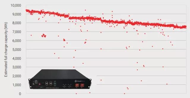 在第二階段測試中,上海派能能源科技(PYLONTECH)的US2000B 是表現(xiàn)最好的,大概在2300個循環(huán)到80%,按照估算在4,470次循環(huán)中到60% 的容量。