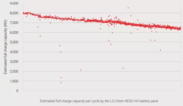 Tesla Powerwall 2 測試大概在1700個循環(huán),容量衰減在83%左右,根據(jù)估算SOH和循環(huán)之間的線性回歸,Tesla Powerwall 2大概在3,680 次循環(huán)以后容量變?yōu)?0%(當然后期的衰減速度可能會加速,不能這么外推)。