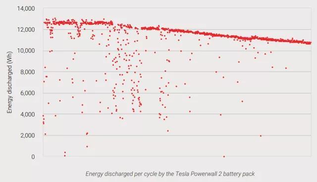 在這份報告中,第一階段特斯拉Power wall的實際表現(xiàn)并不完整,比較有效的數(shù)據(jù)如下圖所示,這個曲線之前在我們看到的報告里面本來就有了。根據(jù)實際的測試數(shù)據(jù)特斯拉