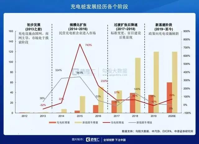 據(jù)格隆匯勾股大數(shù)據(jù)顯示,2013年之前,充電設(shè)施基本由國(guó)家電網(wǎng)和南方電網(wǎng)主導(dǎo),市場(chǎng)處于摸索階段,新能源車多以公共汽車或內(nèi)部用車為主,規(guī)模不大,但能滿足使用需求。2013年新能源車銷量?jī)H1.3萬(wàn)臺(tái),而充電樁增量為4500臺(tái)。