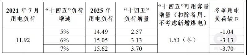 電力平衡應(yīng)該用各省的最高用電負(fù)荷為基數(shù)、預(yù)測各省的負(fù)荷需求,與各省的可用容量進(jìn)行平衡,再加總。本文受限于篇幅和工作量,無法分省測算,用2021年7月14日的全國最高用電負(fù)荷11.92億千瓦為基數(shù),用電負(fù)荷年均增速按5%-7%估算,則“十四五”用電負(fù)荷增量為2.57-3.70億千瓦,而新增的可用容量(不考慮新增煤電、扣除備用)僅1.53億千瓦(冬),冬季負(fù)荷缺口為1.04-3.70億千瓦。