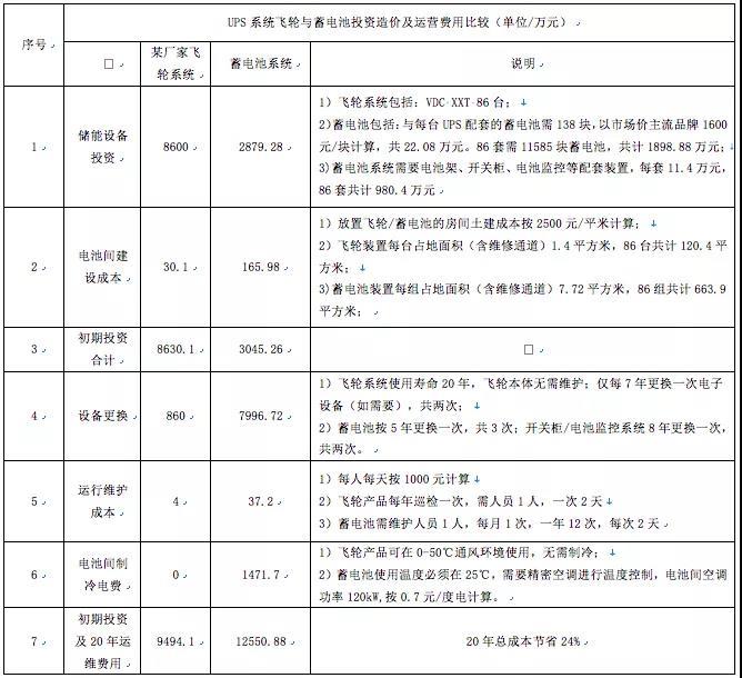 表5. UPS系統(tǒng)飛輪與蓄電池投資造價及運營費用比較