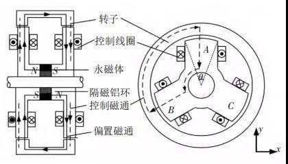 在實際應(yīng)用中,通常將上述幾種軸承結(jié)合起來使用達到優(yōu)勢互補。(1)機械軸承與永磁軸承結(jié)合。機械軸承主要的缺點是摩擦損耗較大,永磁軸承可以幫助克服重力到來的定子、轉(zhuǎn)子之間的壓力,從而減少摩擦損耗。(2)超導體與永磁體混合軸承。超導體作為定子,永磁體做轉(zhuǎn)子,轉(zhuǎn)子能夠懸浮在某一位置。同時超導體中俘獲的磁通由于釘扎力的存在不會隨便運動,保證了軸向穩(wěn)定性,使得轉(zhuǎn)子穩(wěn)定懸浮。(3)電磁與永磁體混合軸承。為了減少功耗,利用永磁體產(chǎn)生偏置磁場,電流產(chǎn)生控制磁場,圖三極混合磁軸承如圖4 所示。
