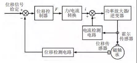 主動磁軸承又稱電磁軸承,是通過改變控制電路中電流的通斷和大小來控制磁場的變化,同時通過實時反饋位置信號與輸出電流信號及時調(diào)整控制電流,從而使軸承定子、轉(zhuǎn)子之間能夠穩(wěn)定懸浮,主動磁軸承控制策略框圖,如圖 3所示。