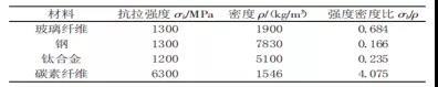由式(2)可以看出,飛輪材料密度成反比,與飛輪材料的許用應(yīng)力成正比。幾種常見的用于飛輪的材料,如表 1 所示。從數(shù)據(jù)中可以看出碳素纖維密度小,強度高,是其中最好的選擇。同時,使用碳素纖維制成的飛輪一旦發(fā)生解體,飛輪本身會變成絮狀物飛出,降低了事故帶來的危害。