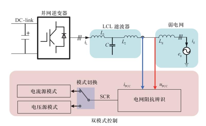 對比以上介紹的電流源模式和電壓源模式的并網(wǎng)逆變器控制穩(wěn)定性可知,二者的差異性本質(zhì)上是由于采用了不同的控制結(jié)構(gòu)導(dǎo)致的,使得并網(wǎng)逆變器對電網(wǎng)呈現(xiàn)出不同的外特性,從而在電網(wǎng)阻抗強(qiáng)弱變化時,產(chǎn)生了一定的“互補(bǔ)”特性。即電流源模式并網(wǎng)逆變器適用于強(qiáng)電網(wǎng),而弱電網(wǎng)穩(wěn)定性下降,在極弱電網(wǎng)下甚至不能穩(wěn)定運(yùn)行;與之相反,在極弱電網(wǎng)和弱電網(wǎng)下的電壓源模式并網(wǎng)逆變器具有較好的穩(wěn)定性,而在強(qiáng)電網(wǎng)下系統(tǒng)則不穩(wěn)定。因此,文獻(xiàn)[3,70-72]提出了基于電網(wǎng)阻抗自適應(yīng)的雙模式控制,如圖6所示。在強(qiáng)電網(wǎng)下并網(wǎng)逆變器采用電流源模式,極弱電網(wǎng)下則切換到電壓源模式,綜合了兩種并網(wǎng)模式的優(yōu)點(diǎn),有效提升了單臺逆變器的電網(wǎng)阻抗適應(yīng)性,但是卻未涉及雙模式控制擴(kuò)展到多逆變器系統(tǒng)時的穩(wěn)定性問題。在文獻(xiàn)[3]的基礎(chǔ)上,文獻(xiàn)[12]將雙模式控制應(yīng)用到多逆變器系統(tǒng),提出多逆變器系統(tǒng)由全電流源模式切換到混合模式,使得系統(tǒng)同時有電流源模式和電壓源模式的并網(wǎng)逆變器,提升了弱電網(wǎng)下的并網(wǎng)逆變器穩(wěn)定性。然而,文獻(xiàn)[12]缺少對全電流源模式和混合模式切換邊界的定量分析,也未考慮電網(wǎng)進(jìn)一步變?nèi)鯐r混合模式系統(tǒng)是否仍舊穩(wěn)定的問題。基于此,文獻(xiàn)[73]進(jìn)一步提出了基于電網(wǎng)阻抗自適應(yīng)的雙模式組合控制策略,將多逆變器系統(tǒng)從混合模式切換到全電壓源模式,從而保證了極弱電網(wǎng)下的系統(tǒng)仍舊有足夠的穩(wěn)定裕度。特別地,該文獻(xiàn)基于D分割法[74-76],研究了在幅值裕度、相位裕度和系統(tǒng)帶寬等多性能指標(biāo)約束下的參數(shù)穩(wěn)定域,得出了SCR大幅波動情況下全電流源模式、混合模式和全電壓模式之間的定量切換邊界。