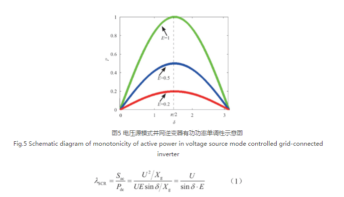根據(jù)式(1)可知單調(diào)邊界對應(yīng)的功角為π/2。帶入式(1)所示的SCR公式,且通過加入無功功率支撐使得E=U,可得此時對應(yīng)的SCR為1,根據(jù)實(shí)際物理系統(tǒng)中SCR的定義可知,SCR不會小于1,因此,電壓源模式并網(wǎng)逆變器在更弱的電網(wǎng)下仍能夠穩(wěn)定運(yùn)行[3]。