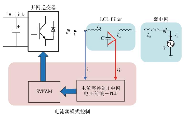 并網(wǎng)逆變器主要采用基于鎖相環(huán)(phase-locked loop,PLL)控制的電網(wǎng)電壓定向方案[10-11],該控制方式下并網(wǎng)逆變器可等效為一個電流源[3,12],稱為電流源模式,如圖2所示。PLL是一種結(jié)構(gòu)簡單,強(qiáng)電網(wǎng)下性能穩(wěn)定的并網(wǎng)同步單元。從圖2可見,電流源模式并網(wǎng)逆變器除了需要PLL外,通常還采用電網(wǎng)電壓前饋,以提升并網(wǎng)逆變器在電網(wǎng)電壓發(fā)生擾動情況下的動態(tài)響應(yīng)性能,并抑制由于電網(wǎng)電壓背景諧波引起的電網(wǎng)電流諧波等問題。