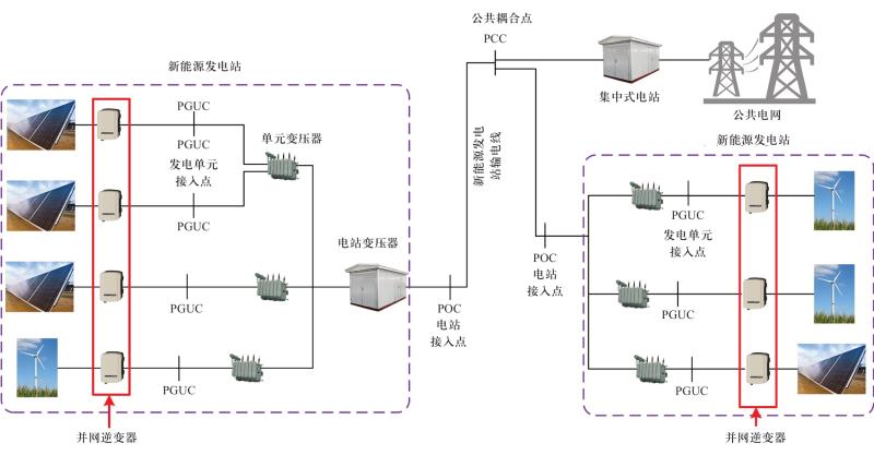 典型的高滲透率新能源并網(wǎng)發(fā)電系統(tǒng)如圖1所示。新能源通過并網(wǎng)逆變器接入新能源發(fā)電單元接入點(diǎn)(point of generating unit connection,PGUC),多個新能源發(fā)電單元通過電站變壓器匯集到電站接入點(diǎn)(point of connection,POC),然后多個新能源發(fā)電站再通過輸電線路匯集到公共耦合點(diǎn)(point of common coupling,PCC)。從圖中可以看出,不論是太陽能或風(fēng)能,都必須經(jīng)過并網(wǎng)逆變器才能實(shí)現(xiàn)并網(wǎng)發(fā)電。可見,并網(wǎng)逆變器是新能源發(fā)電必不可少的關(guān)鍵環(huán)節(jié),承擔(dān)著能量高效轉(zhuǎn)換的關(guān)鍵任務(wù)。并網(wǎng)逆變器與電網(wǎng)的聯(lián)接與交互是影響新能源并網(wǎng)發(fā)電系統(tǒng)穩(wěn)定、高效運(yùn)行的關(guān)鍵因素。